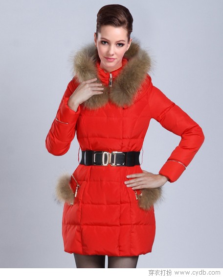 年夜毛领束腰羽绒服