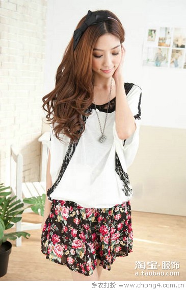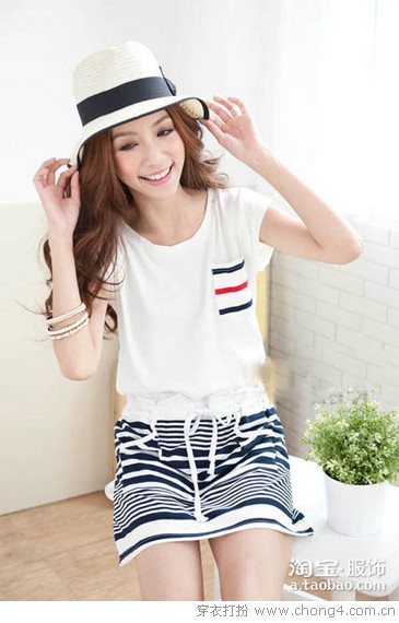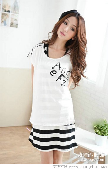03 拼色假两件棉T+条纹半身裙,很有休闲的味道哦!同时也为你省去繁琐的搭配!上身是超个性的一件棉T,背心+蝙蝠袖看似两件,其实是一件,下身条纹半身裙,松紧腰带设计,赚足回头率哦!