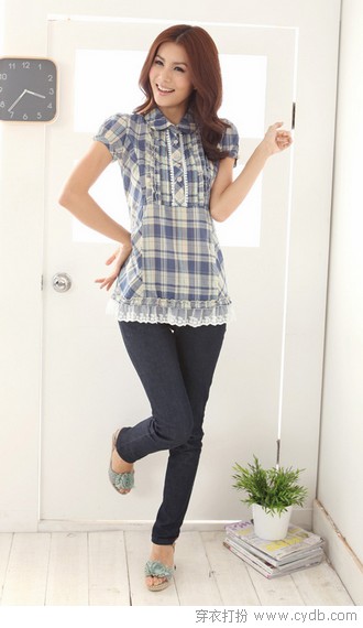 02 高腰的版型加上集中在胸前的蕾丝与木耳边使整体视觉效果上移,巧妙遮掩小肚腩,微胖却苦恼于胸围不够丰满的MM有福咯。适合搭配小脚裤和热裤,可爱的蕾丝边下摆为衬衫增加趣味,揭示日式少女感。