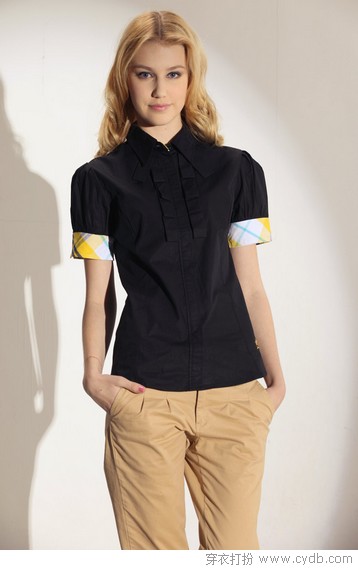 05 忧闷白衬衫会显胖的MM亦可尝试深色的衬衫,不单能起到显瘦效果,更显得脾气沉稳娴静。用彩格纹拼接的袖口点亮整个造型,令学院气息更稠密,减龄效果也特别很是棒。