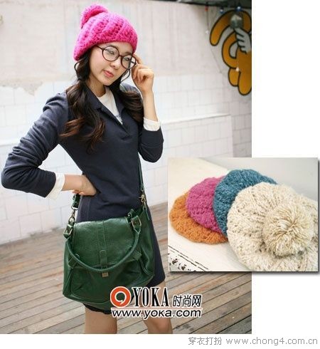02 毛线帽子十分亲民。粗粗的毛线织成一顶圆咕隆咚的帽子,帽子顶上坠上一颗年夜年夜的毛线球儿,侧边一排小扣子排排坐吃果果,可爱又俏皮。前额的拼色设计又使得帽子整体协调而不单调。